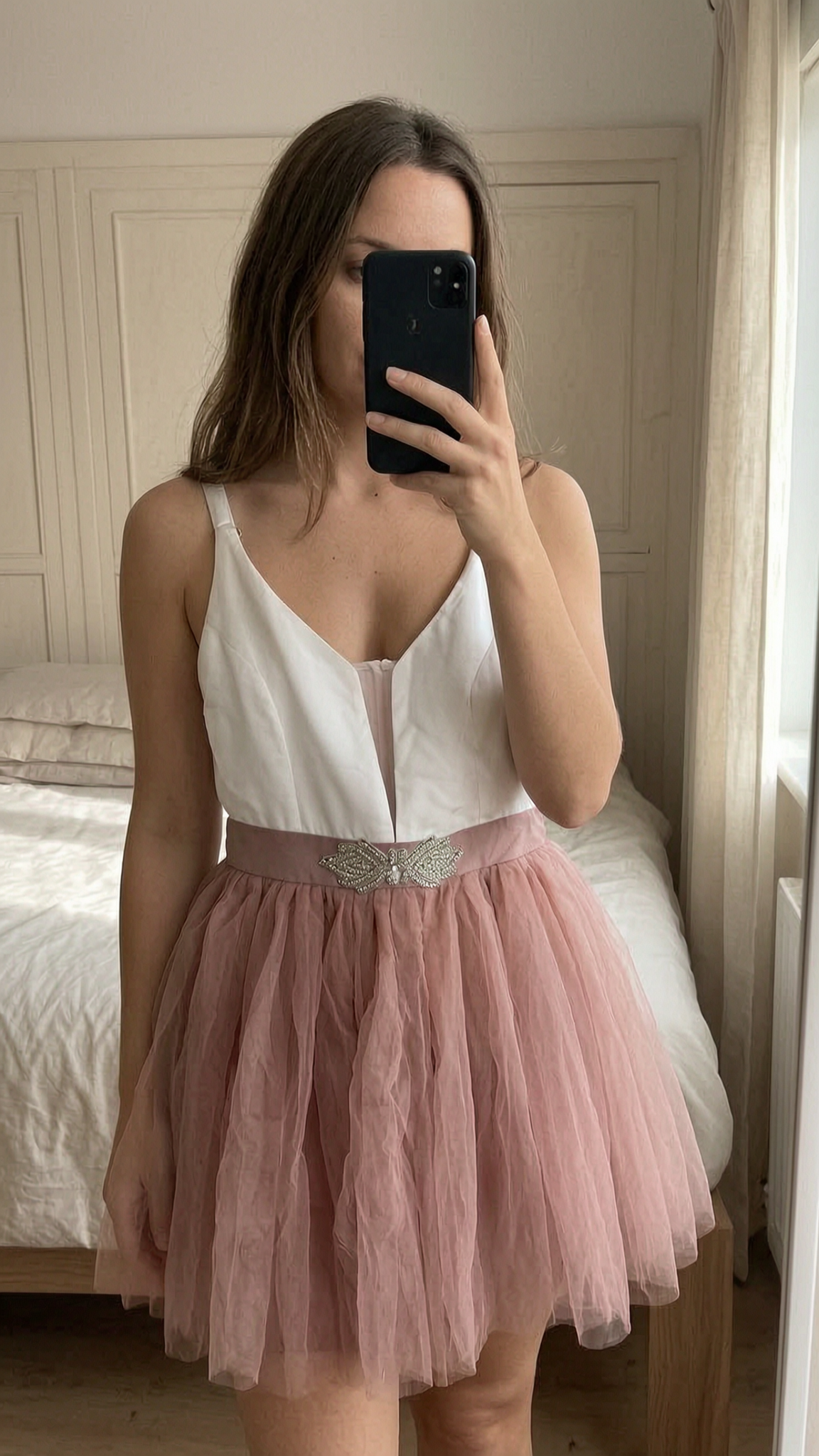 Süßes Tuil-Kleid in Weiß/Staubrosa/Silber aufrecht stehend, der Kamera zugewandt, in einem sanft beleuchteten Schlafzimmer, mit natürlichem Licht, das durch ein Fenster fällt.
