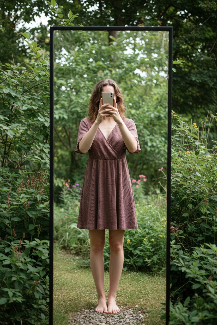 Eine Person in Süßes, verspieltes Kleid Waffeloptik | Gr. S aufrecht stehend, der Kamera zugewandt, mit schlanker Figur, im Freien, in einer natürlichen Umgebung, umgeben von Grün und sanftem Tageslicht.