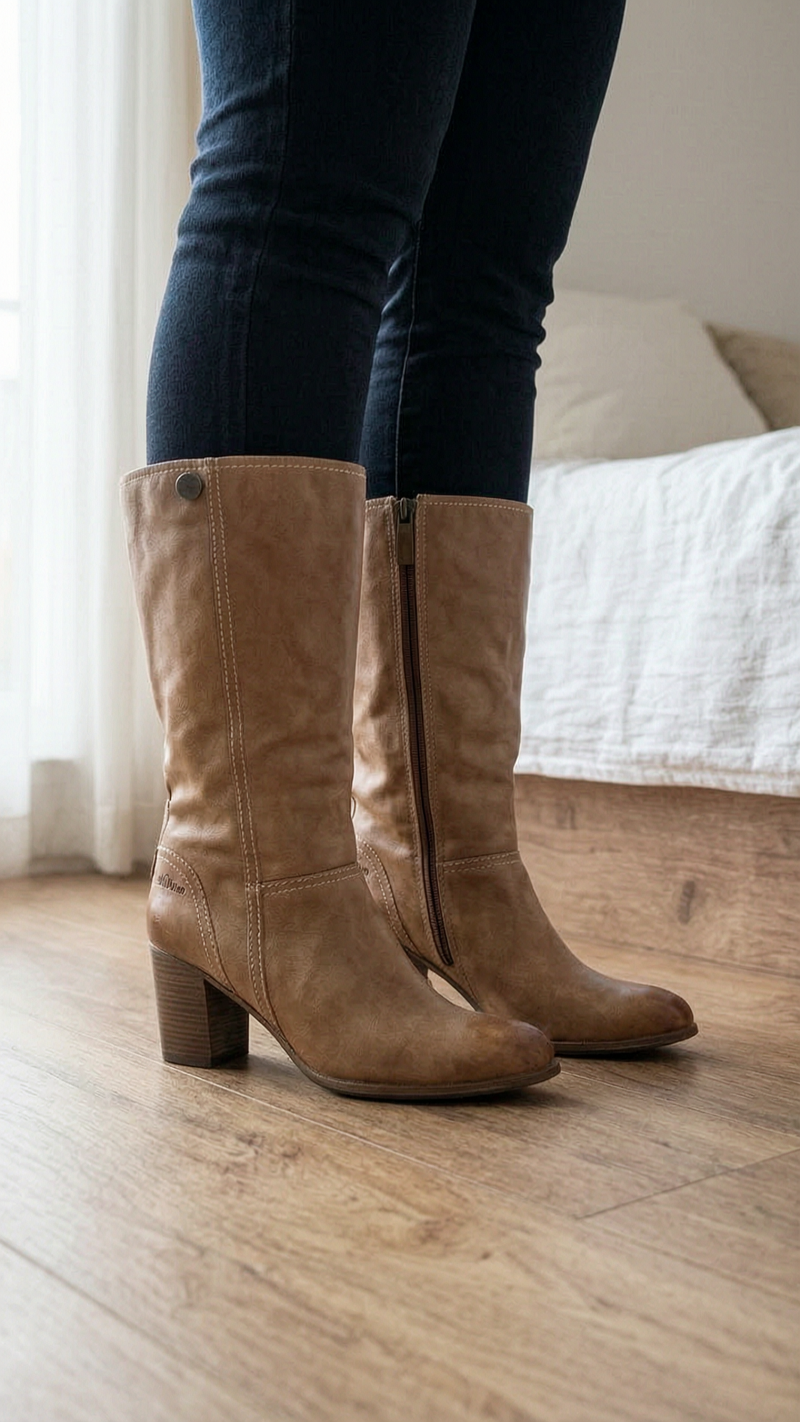 S. Oliver Stiefel aufrecht stehend, der Kamera zugewandt, in einem sanft beleuchteten Schlafzimmer, mit natürlichem Licht, das durch ein Fenster fällt.