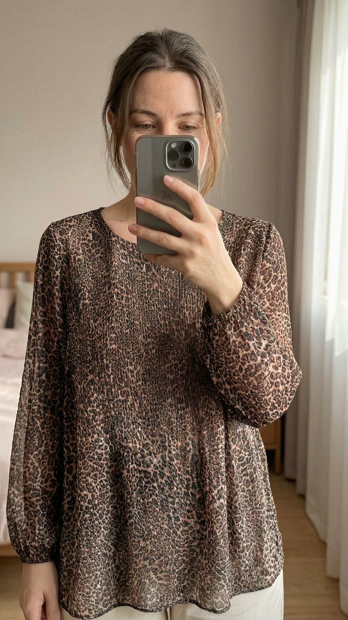Sabrina Diamanti made in Italy Bluse mit Leopardmuster aufrecht stehend, der Kamera zugewandt, in einem sanft beleuchteten Schlafzimmer, mit natürlichem Licht, das durch ein Fenster fällt.