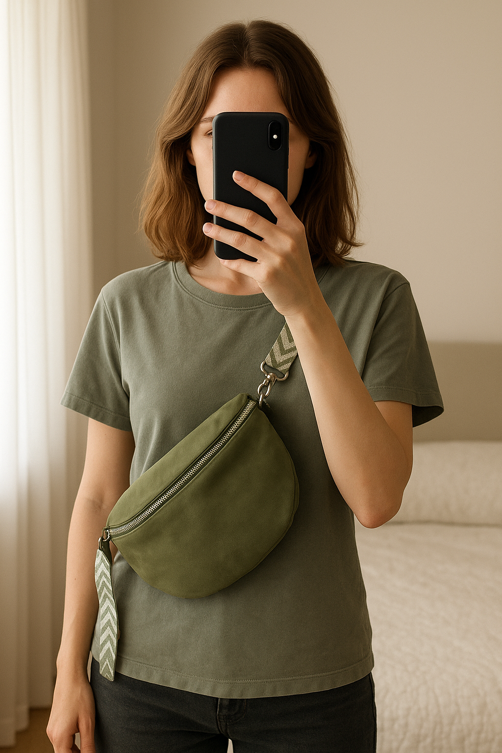Sac banane Aveiro 🍃 en velours debout, face à la caméra, dans une chambre à la lumière douce, avec une lumière naturelle filtrant par la fenêtre.