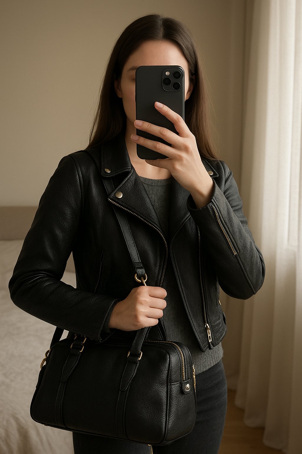 Sac à bandoulière debout, face à la caméra, dans une chambre à la lumière douce, avec une lumière naturelle filtrant par la fenêtre.