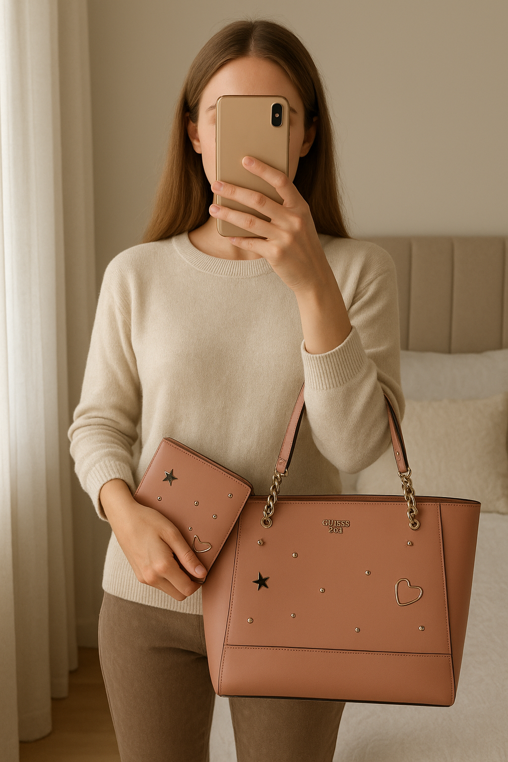 Sac à main Guess avec portefeuille debout, face à la caméra, dans une chambre à la lumière douce, avec une lumière naturelle filtrant par la fenêtre.