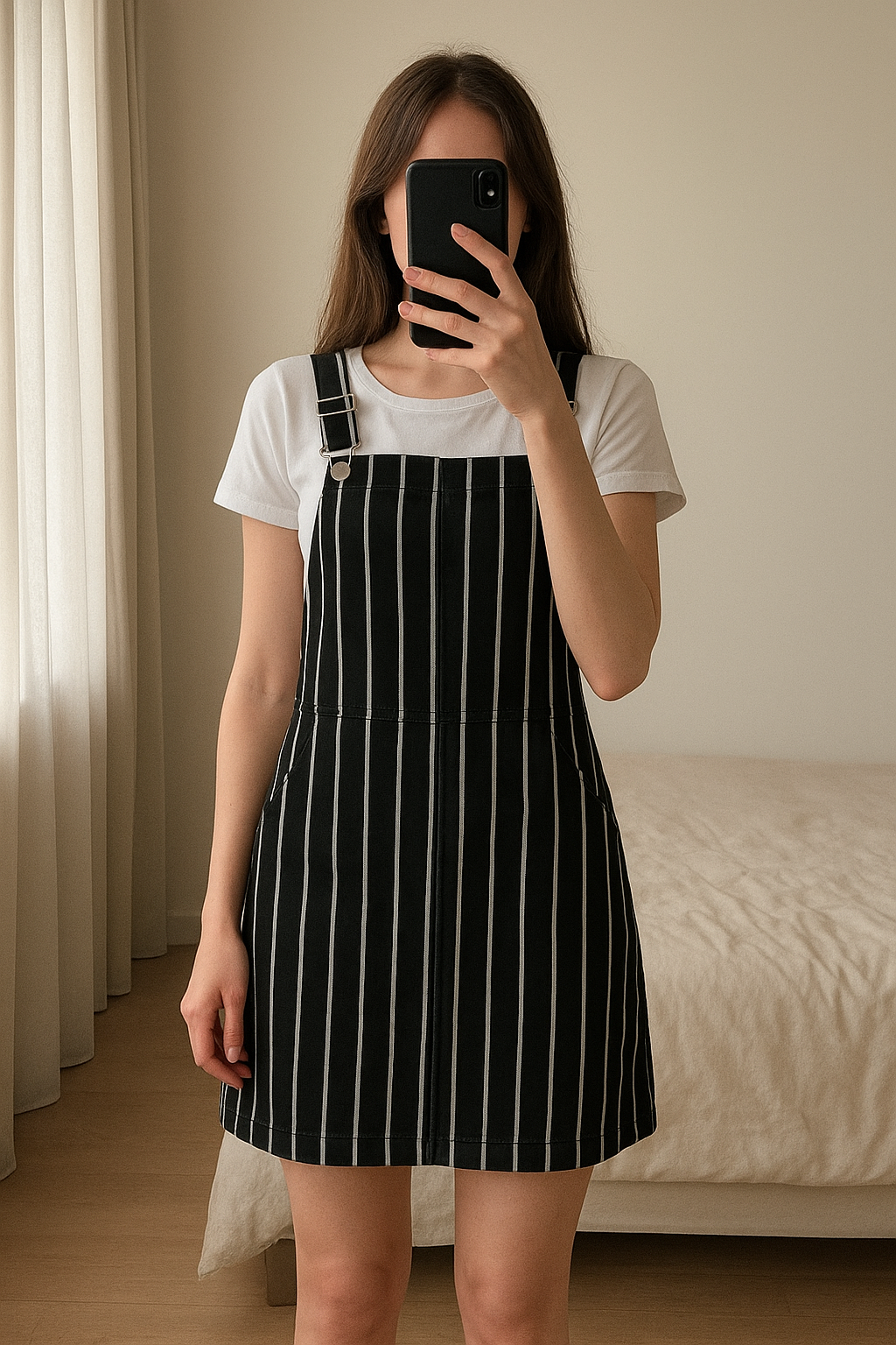 Salopette a rayure noir et blanche neuf debout, face à la caméra, dans une chambre à la lumière douce, avec une lumière naturelle filtrant par la fenêtre.