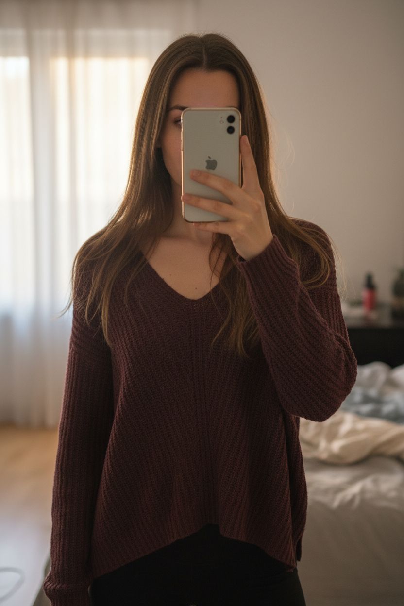 Eine Person in Schöner Strickpullover | Gr. S aufrecht stehend, der Kamera zugewandt, mit schlanker Figur, in einem sanft beleuchteten Schlafzimmer, mit natürlichem Licht, das durch ein Fenster fällt.