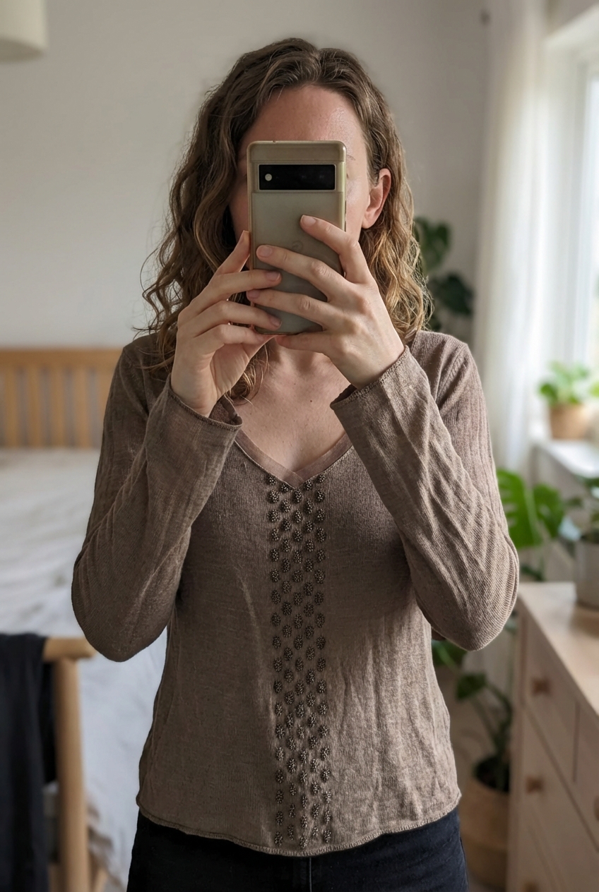 Schöner Vintage Pullover mit Details | Gr. M aufrecht stehend, der Kamera zugewandt, in einem sanft beleuchteten Schlafzimmer, mit natürlichem Licht, das durch ein Fenster fällt.