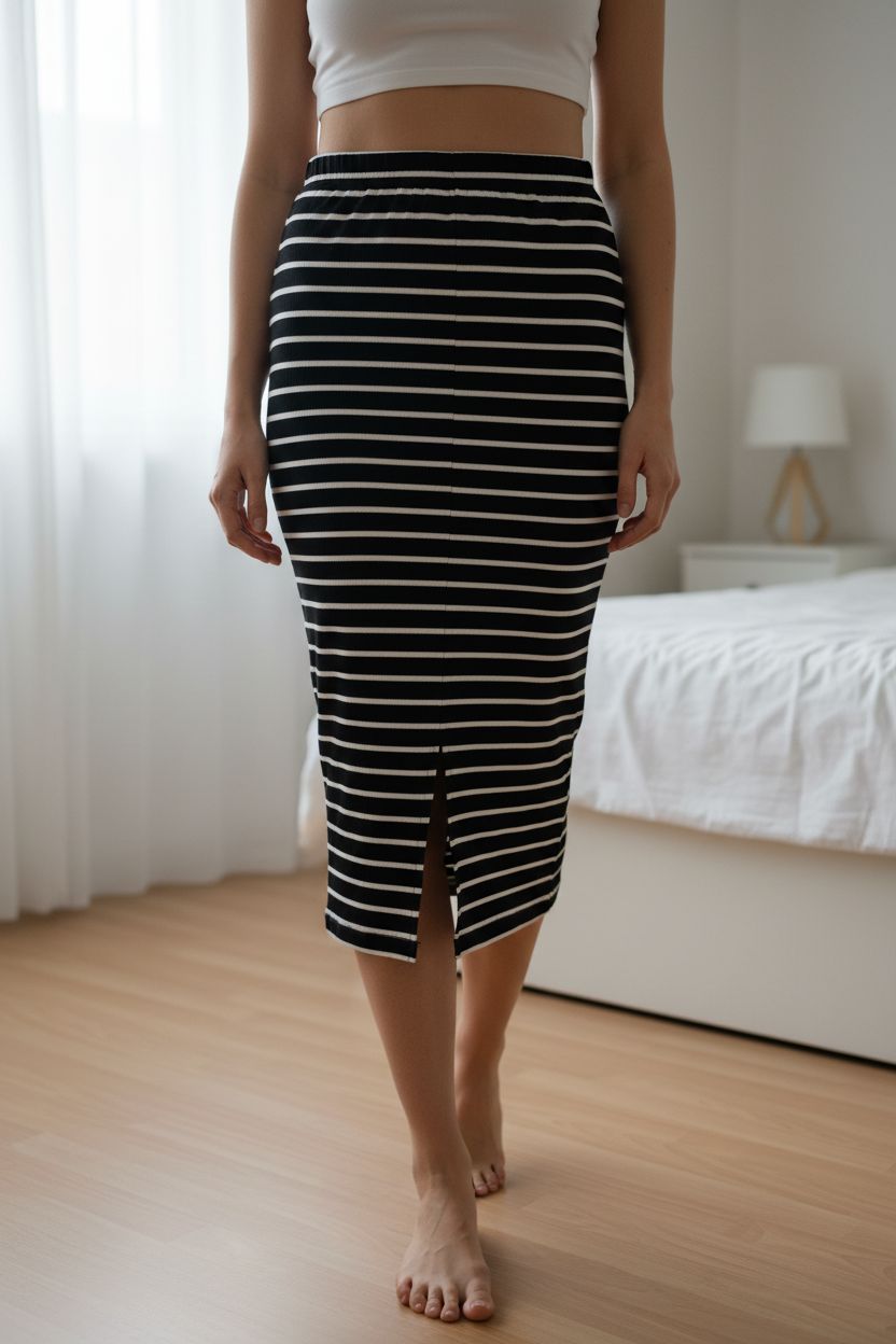 Eine Person in Schwarz-weißer Streifen Midi-Rock mit Schlitz – figurbetont & stretchy (Größe 42) aufrecht stehend, der Kamera zugewandt, in einem sanft beleuchteten Schlafzimmer, mit natürlichem Licht, das durch ein Fenster fällt.