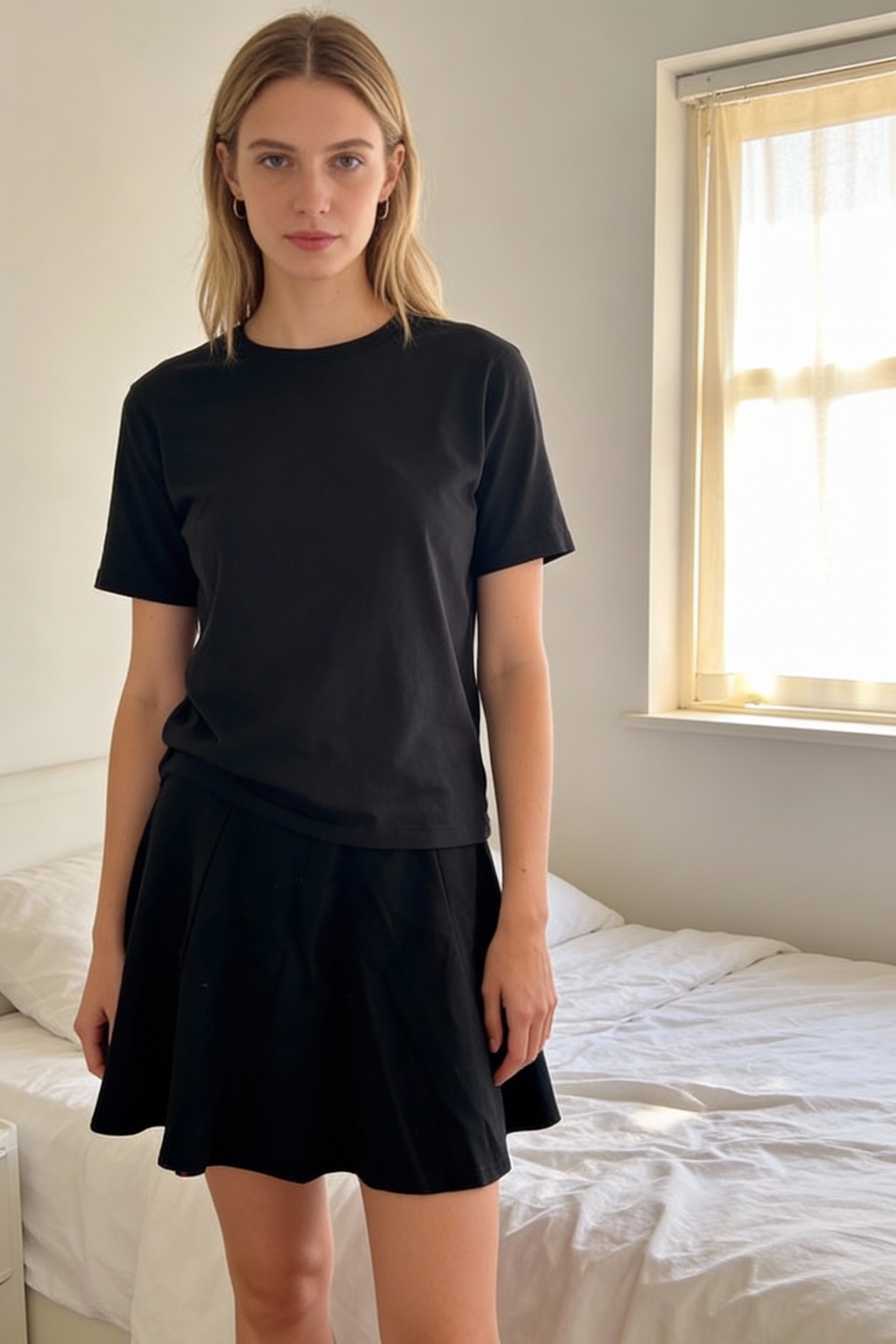 Schwarzer ausgestellter HM Minirock aufrecht stehend, der Kamera zugewandt, in einem sanft beleuchteten Schlafzimmer, mit natürlichem Licht, das durch ein Fenster fällt.