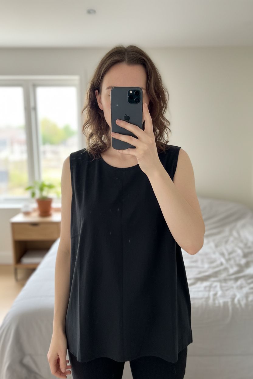 Schwarzes/Anthrazit Top Gr. L locker geschnitten aufrecht stehend, der Kamera zugewandt, in einem sanft beleuchteten Schlafzimmer, mit natürlichem Licht, das durch ein Fenster fällt.