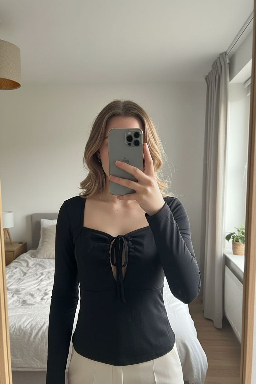 Schwarzes Langarm Top Damen – Trendyol – Gr. L aufrecht stehend, der Kamera zugewandt, in einem sanft beleuchteten Schlafzimmer, mit natürlichem Licht, das durch ein Fenster fällt.