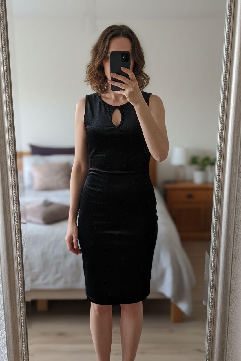 Eine Person in Schwarzes Samtkleid Größe 40 – elegant, figurbetont mit Cut-Out aufrecht stehend, der Kamera zugewandt, in einem sanft beleuchteten Schlafzimmer, mit natürlichem Licht, das durch ein Fenster fällt.