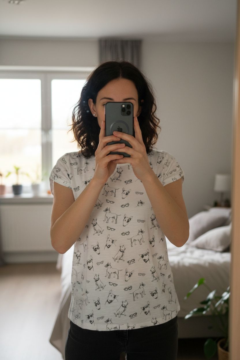 Eine Person in Shirt mit Print von EDC | Gr. S den Rücken leicht gewölbt für eine dynamische Pose, mit schlanker Figur, in einem sanft beleuchteten Schlafzimmer, mit natürlichem Licht, das durch ein Fenster fällt.