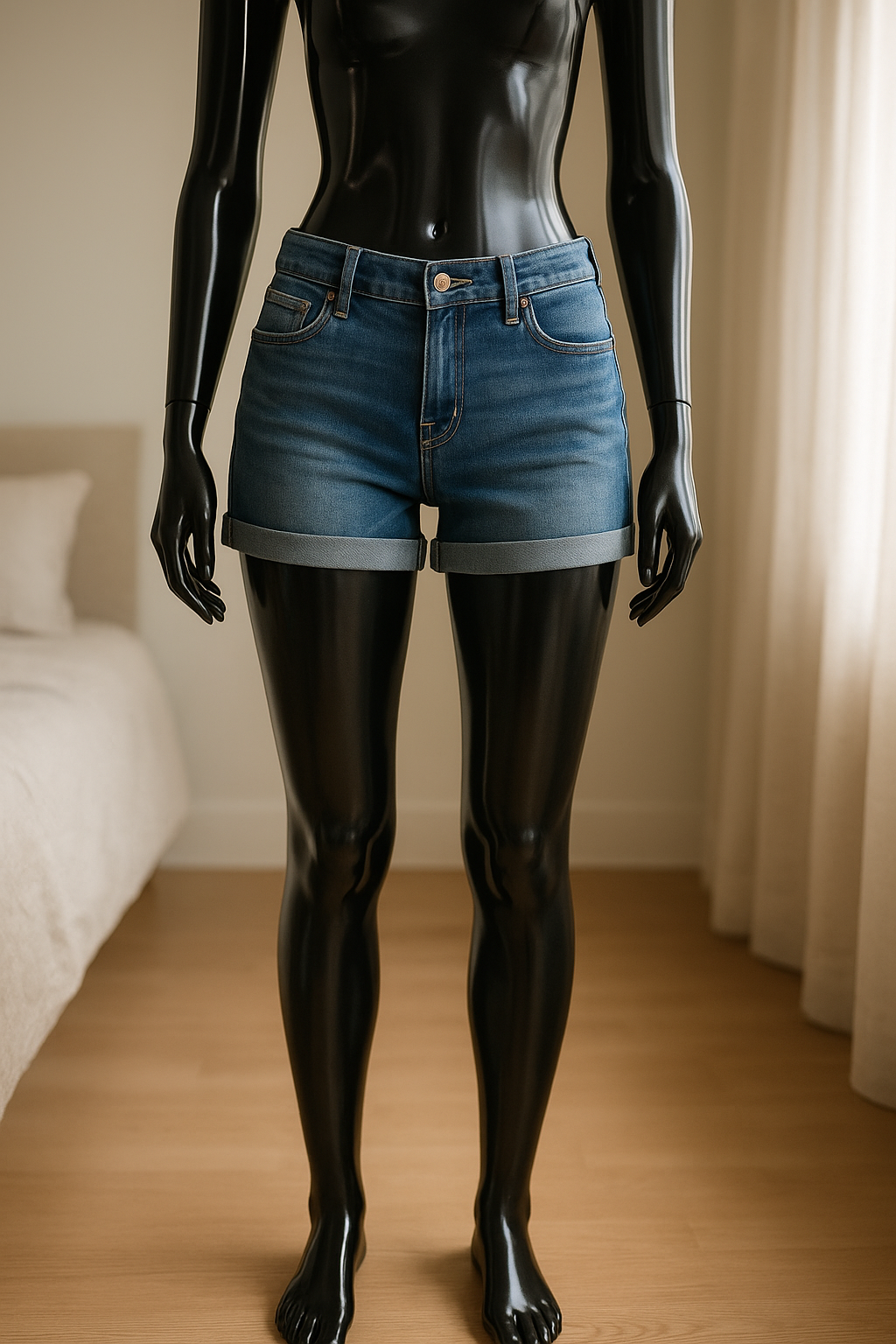 un maniquí negro brillante de plástico sin rasgos faciales con Short taille 36 / Pantalón corto talla S de pie, mirando a la cámara, con tipo de cuerpo delgado, en un dormitorio con luz suave y natural filtrándose por la ventana.