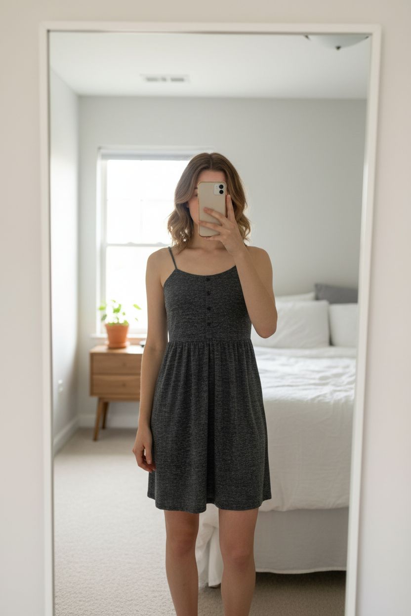 Skaterkleid | Gr. 158/164 (XS-S) aufrecht stehend, der Kamera zugewandt, in einem sanft beleuchteten Schlafzimmer, mit natürlichem Licht, das durch ein Fenster fällt.
