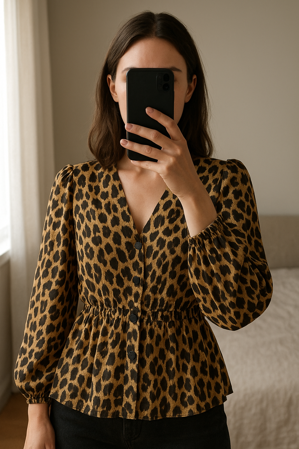 Smocked leopard print blouse 🐆 standing straight facing the camera, in a softly lit bedroom setting, with gentle natural light filtering through a window.