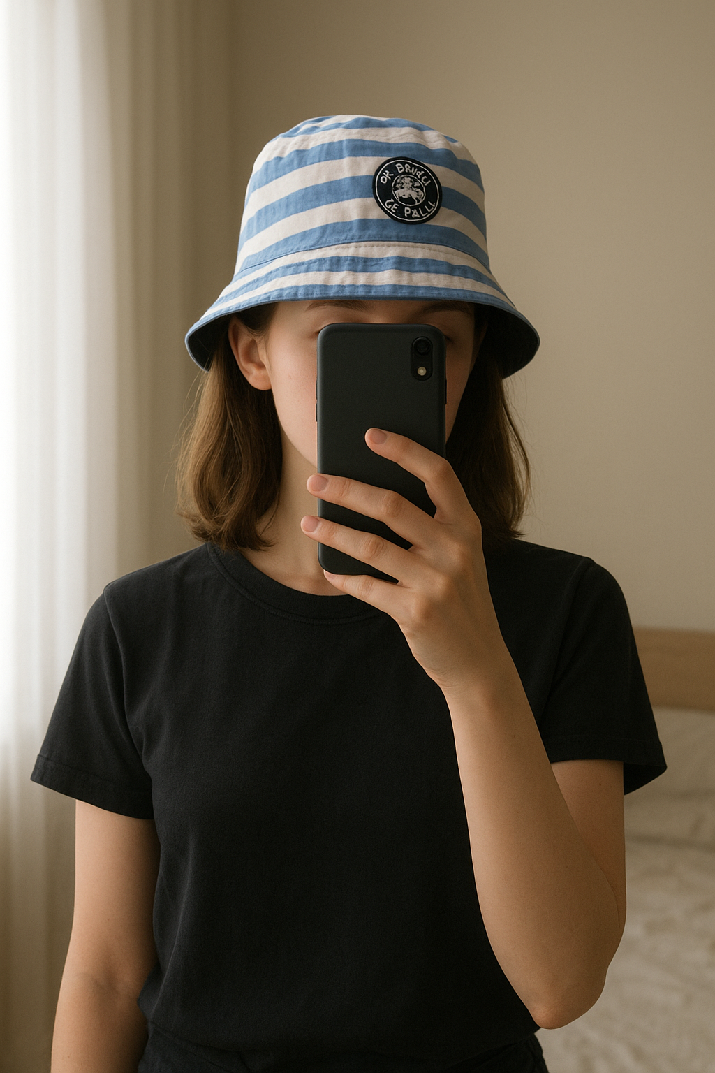 Sommermütze aufrecht stehend, der Kamera zugewandt, in einem sanft beleuchteten Schlafzimmer, mit natürlichem Licht, das durch ein Fenster fällt.