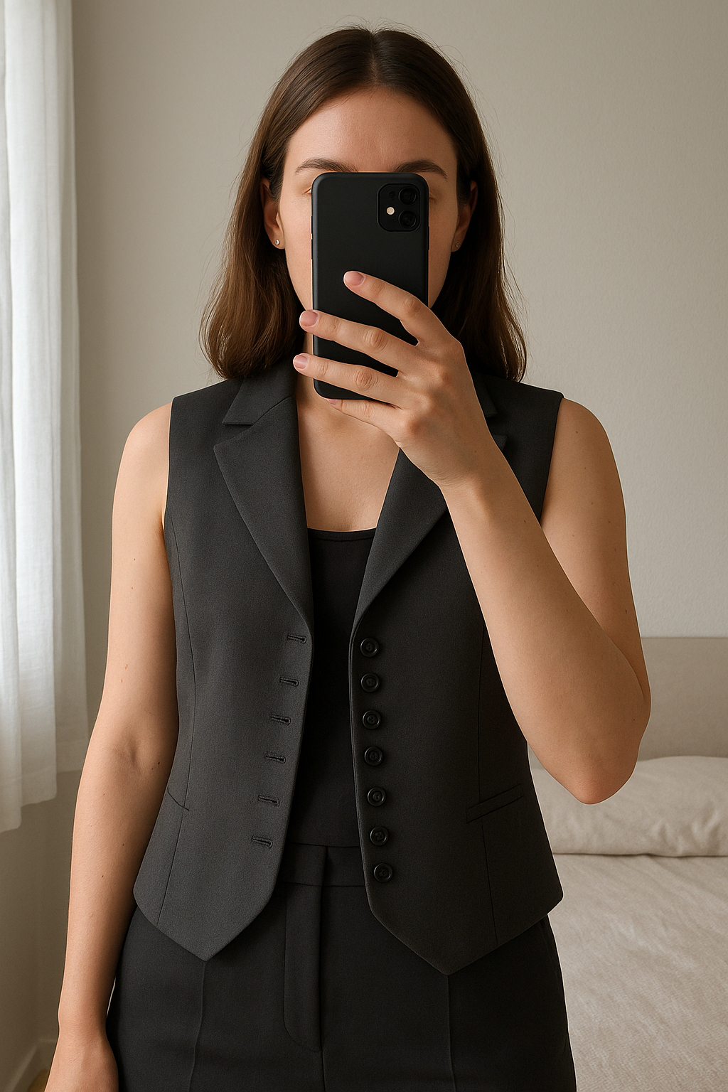 Sous blazer sans manches NA-KD debout, face à la caméra, dans une chambre à la lumière douce, avec une lumière naturelle filtrant par la fenêtre.