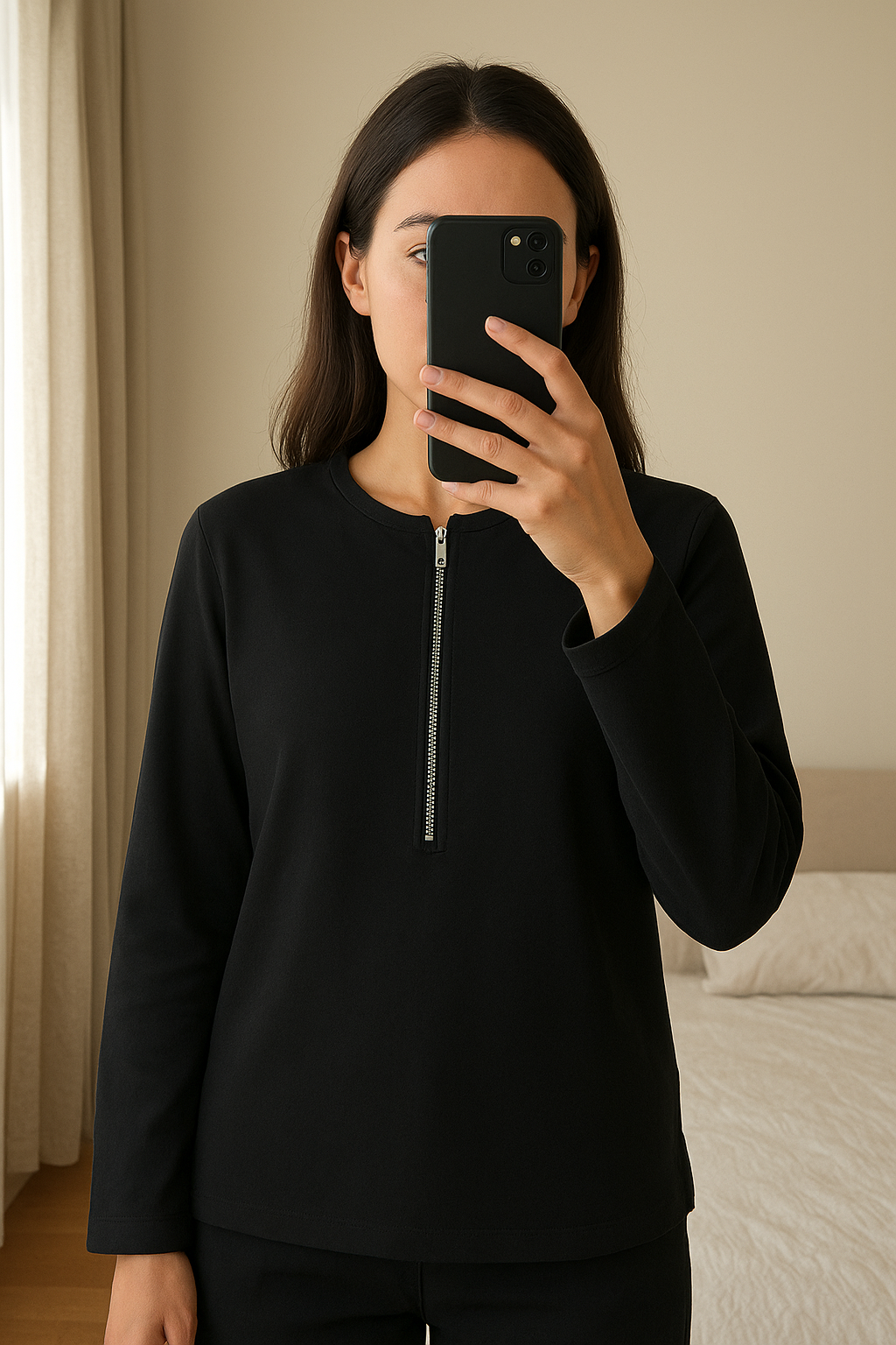 Stella McCartney Arlesa Zip Top size 34EUR/4UK standing straight facing the camera, in a softly lit bedroom setting, with gentle natural light filtering through a window.