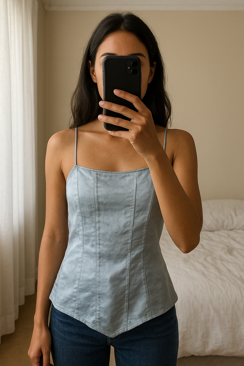 A person in Structured Blue Stain Corset Top standing straight facing the camera, with a slim body type, in a softly lit bedroom setting, with gentle natural light filtering through a window.