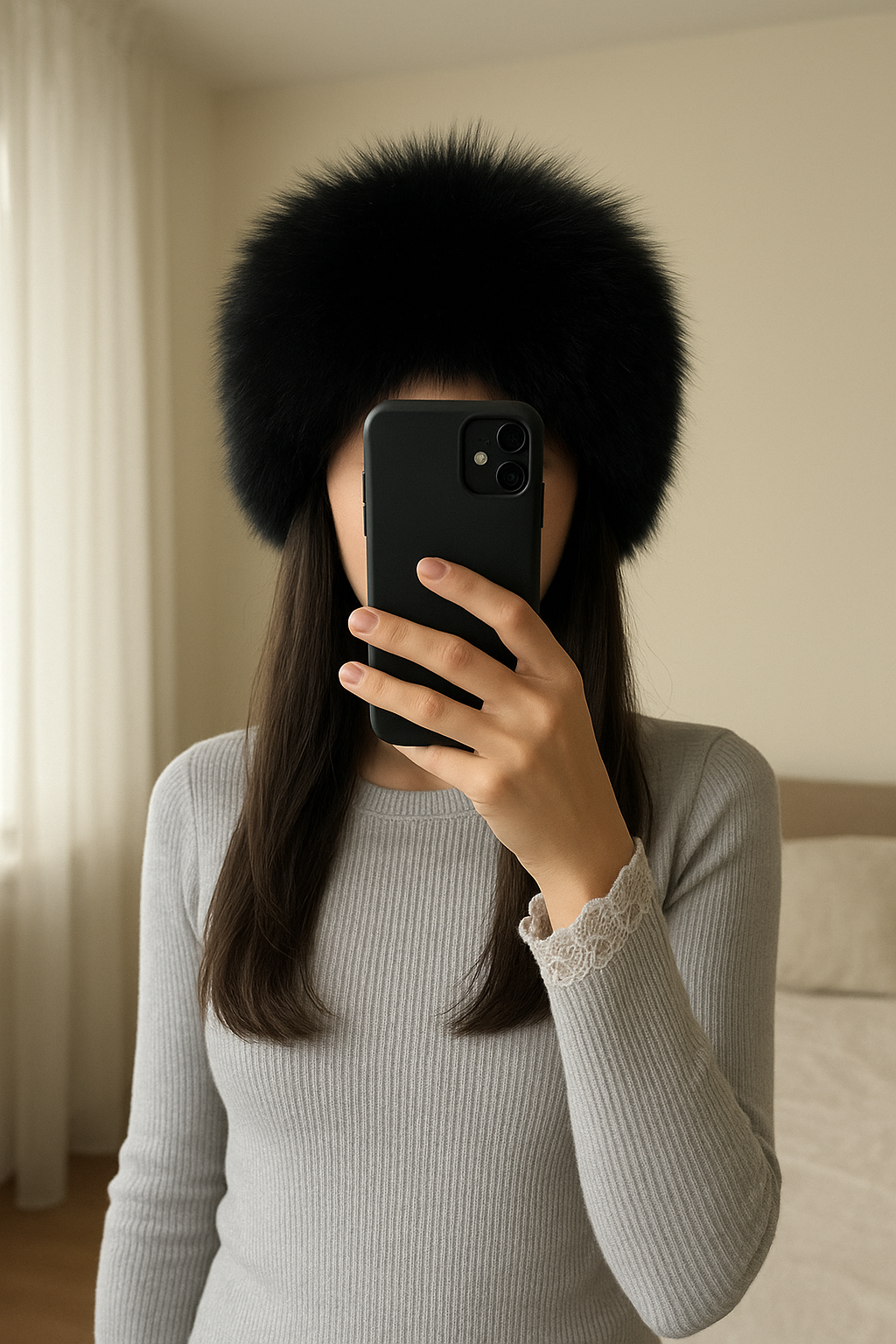 Sublime chapeau style chapka russe NEUF debout, face à la caméra, dans une chambre à la lumière douce, avec une lumière naturelle filtrant par la fenêtre.