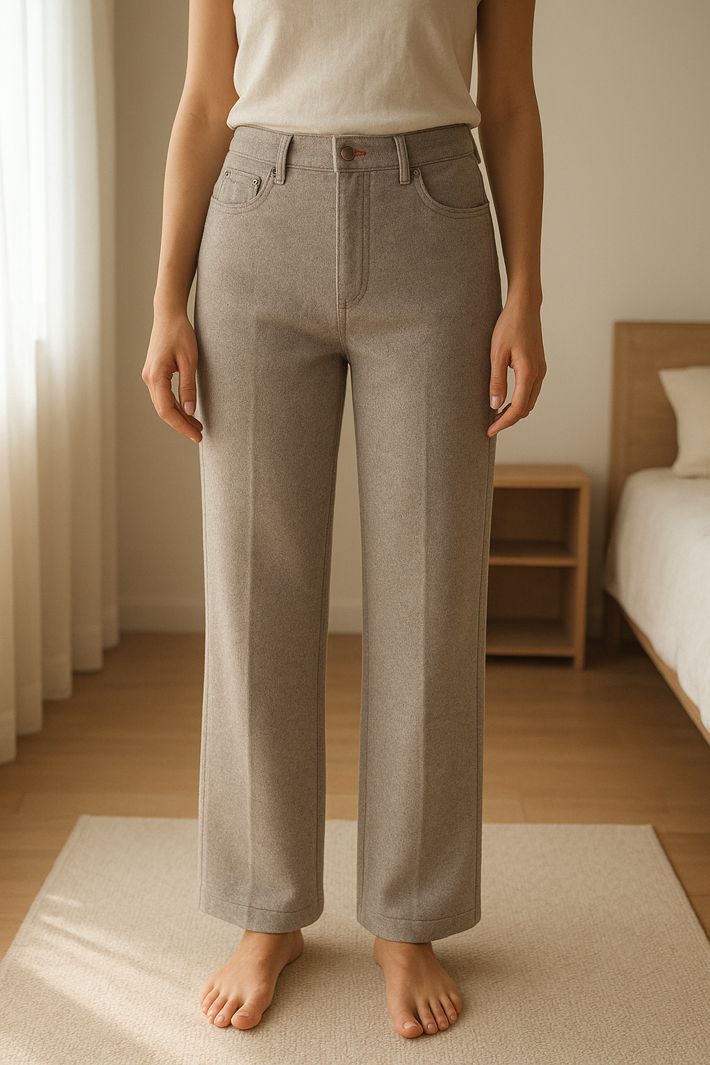 Sublime pantalon en laine à jambes larges. debout, face à la caméra, dans une chambre à la lumière douce, avec une lumière naturelle filtrant par la fenêtre.