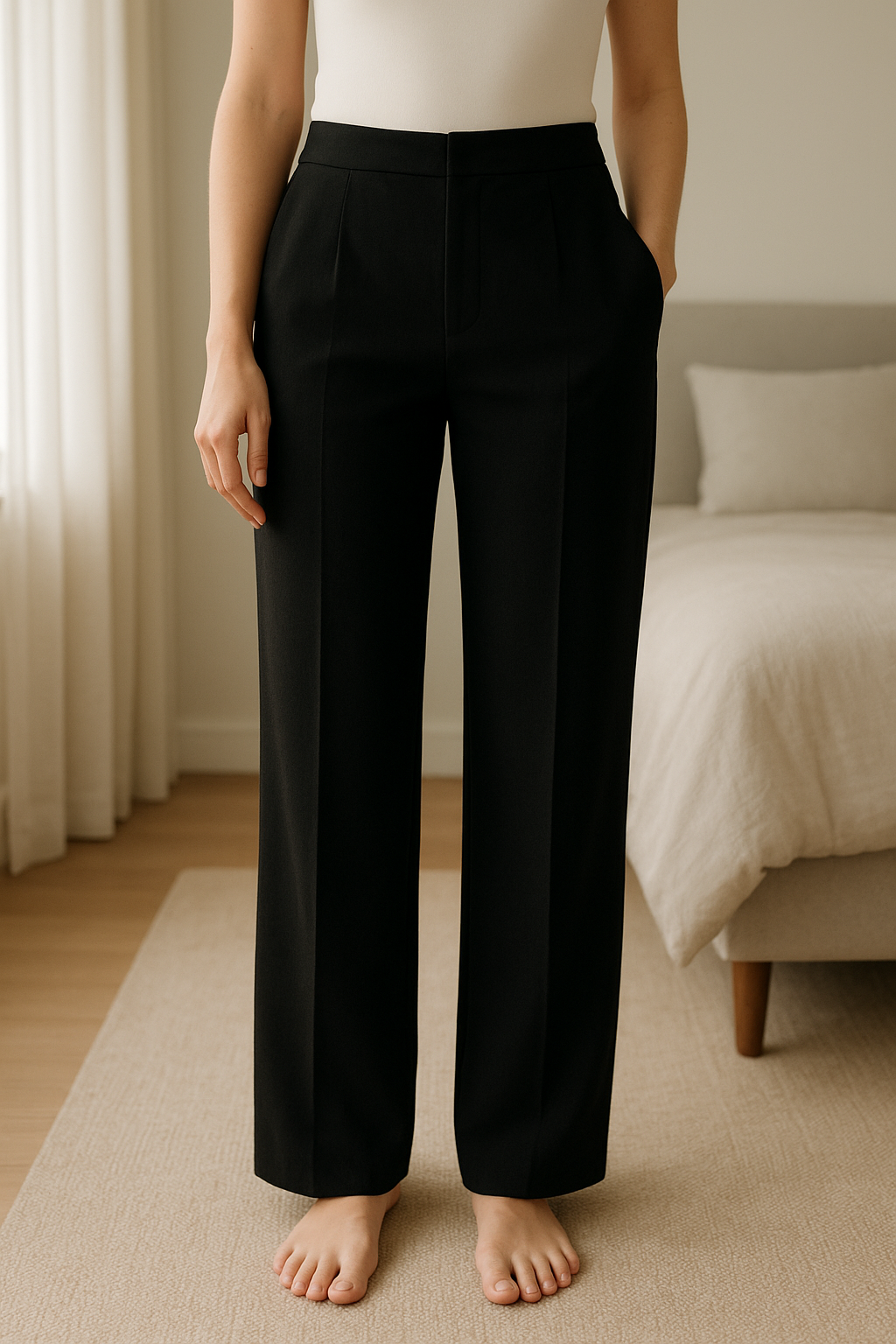 Sublime pantalon habillé en pure laine. debout, face à la caméra, dans une chambre à la lumière douce, avec une lumière naturelle filtrant par la fenêtre.