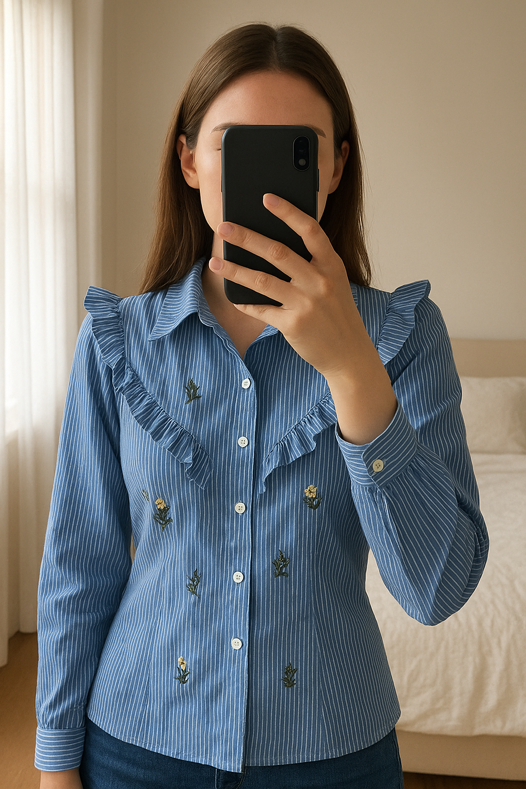 Superbe chemise zara rayée avec des fleurs debout, face à la caméra, dans une chambre à la lumière douce, avec une lumière naturelle filtrant par la fenêtre.