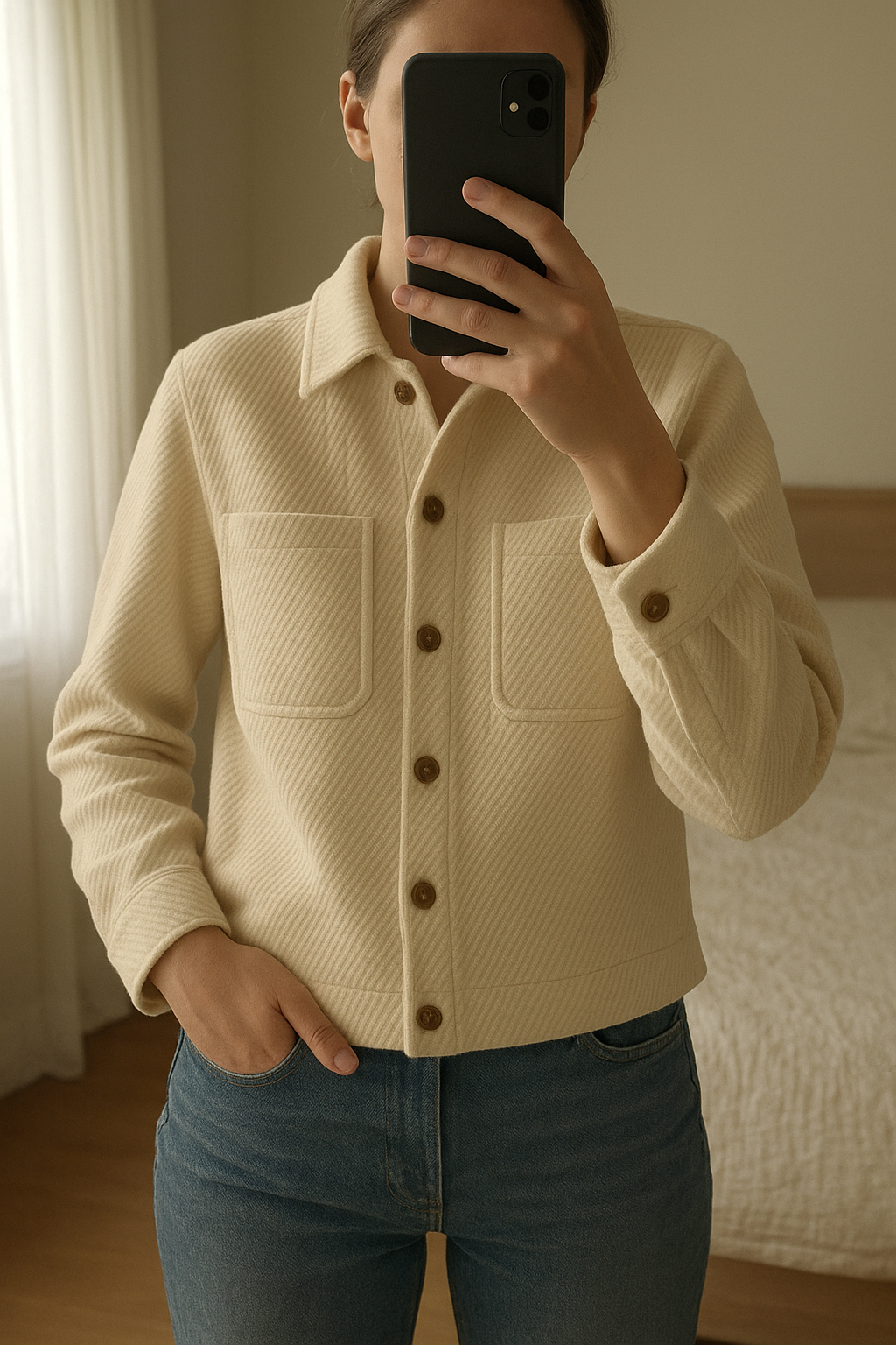 Surchemise debout, face à la caméra, dans une chambre à la lumière douce, avec une lumière naturelle filtrant par la fenêtre.