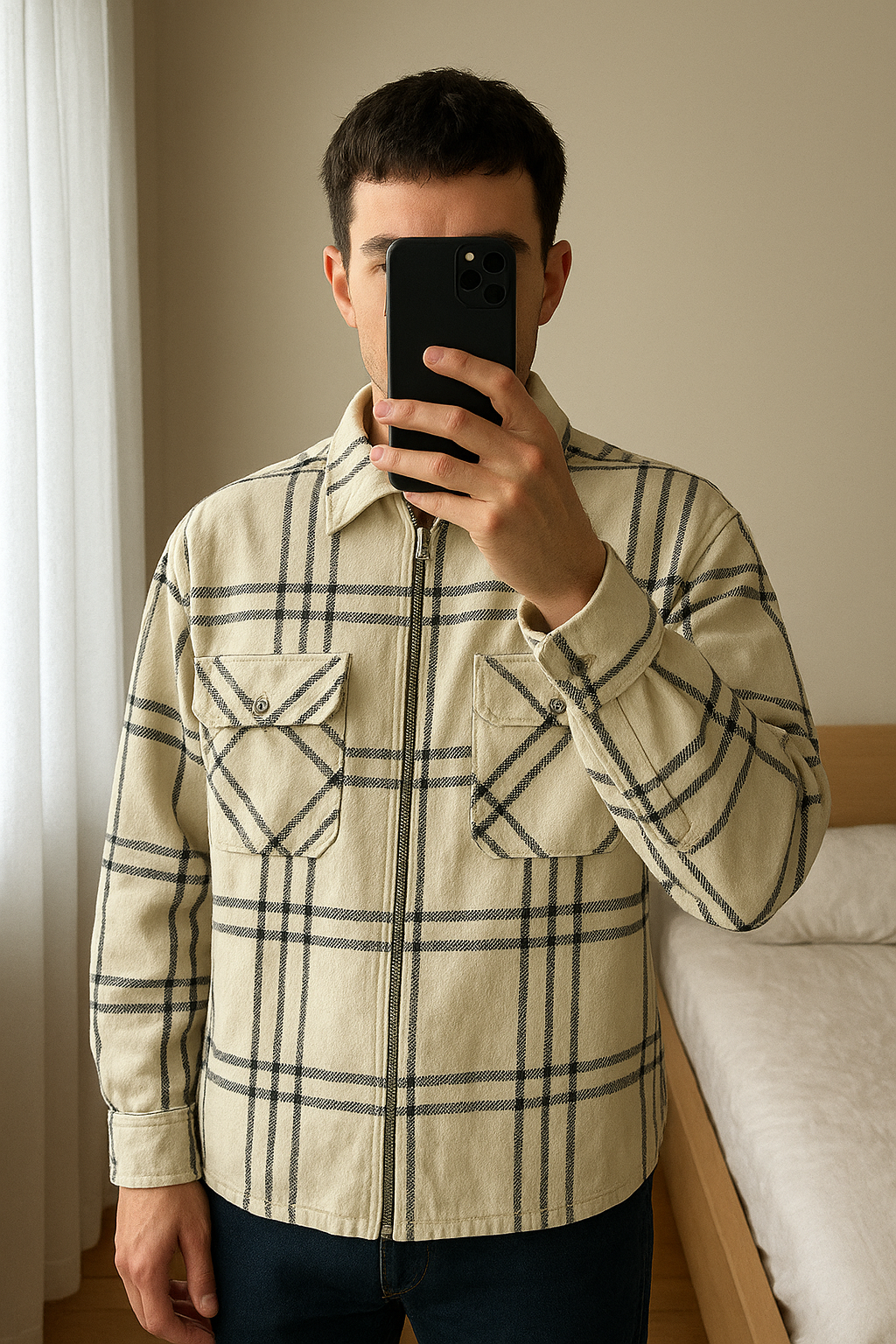 Surchemise Zara Homme - Taille S - Imprimé à carreaux debout, face à la caméra, dans une chambre à la lumière douce, avec une lumière naturelle filtrant par la fenêtre.