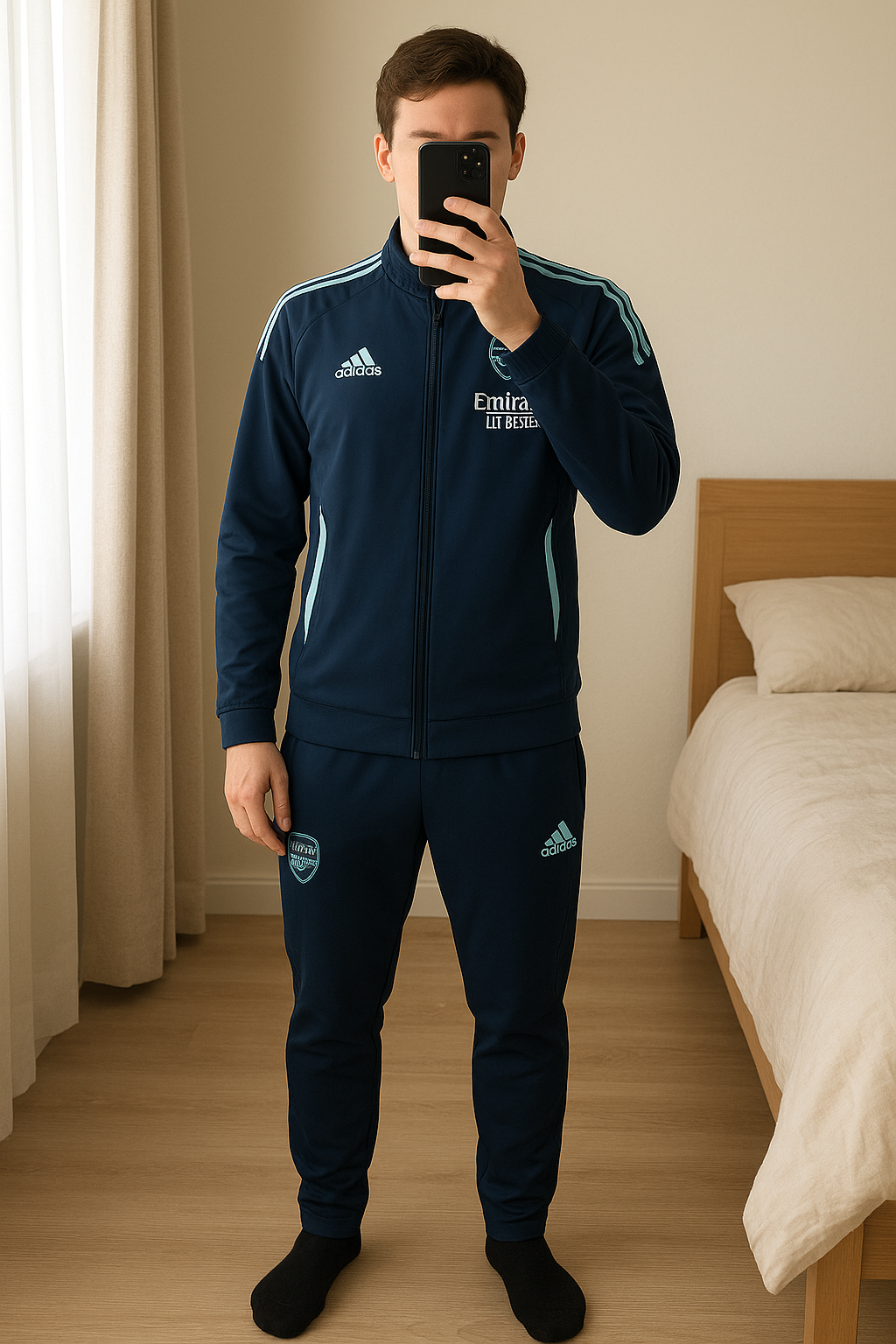 Survêtement arsenal debout, face à la caméra, dans une chambre à la lumière douce, avec une lumière naturelle filtrant par la fenêtre.
