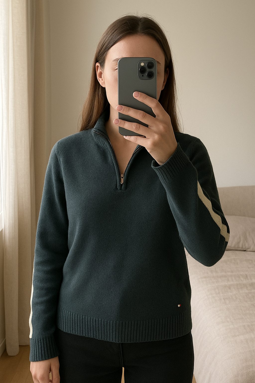 Sweat 1/4 zip Tommy Hilfiger – femme taille M – bleu marine – bandes blanches – petits défauts C10 debout, face à la caméra, dans une chambre à la lumière douce, avec une lumière naturelle filtrant par la fenêtre.