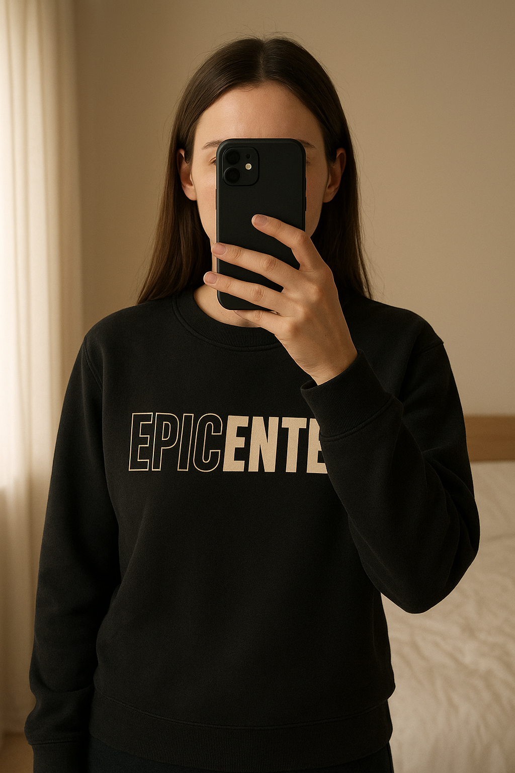 Sweat Bershka Epicenter Xs/S debout, face à la caméra, dans une chambre à la lumière douce, avec une lumière naturelle filtrant par la fenêtre.