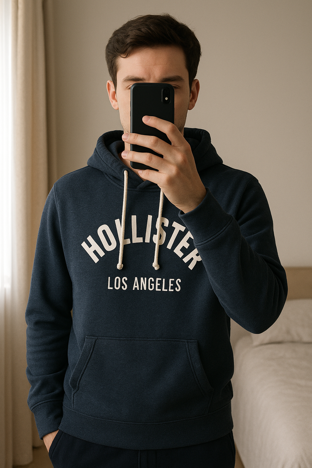 Sweat à capuche debout, face à la caméra, dans une chambre à la lumière douce, avec une lumière naturelle filtrant par la fenêtre.