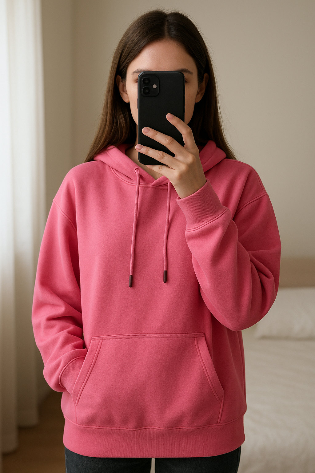 Sweat à capuche rose H&M taille S. Neuf debout, face à la caméra, dans une chambre à la lumière douce, avec une lumière naturelle filtrant par la fenêtre.