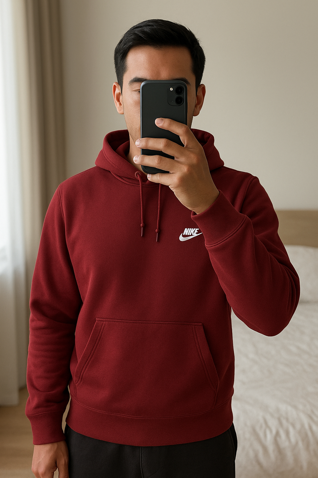 Une personne en Sweat capuche taille S debout, face à la caméra, dans une chambre à la lumière douce, avec une lumière naturelle filtrant par la fenêtre.