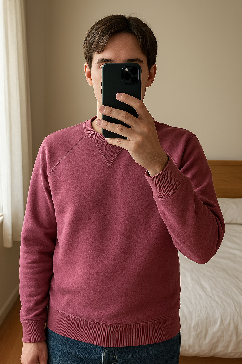 Sweat carhartt taille S debout, face à la caméra, dans une chambre à la lumière douce, avec une lumière naturelle filtrant par la fenêtre.