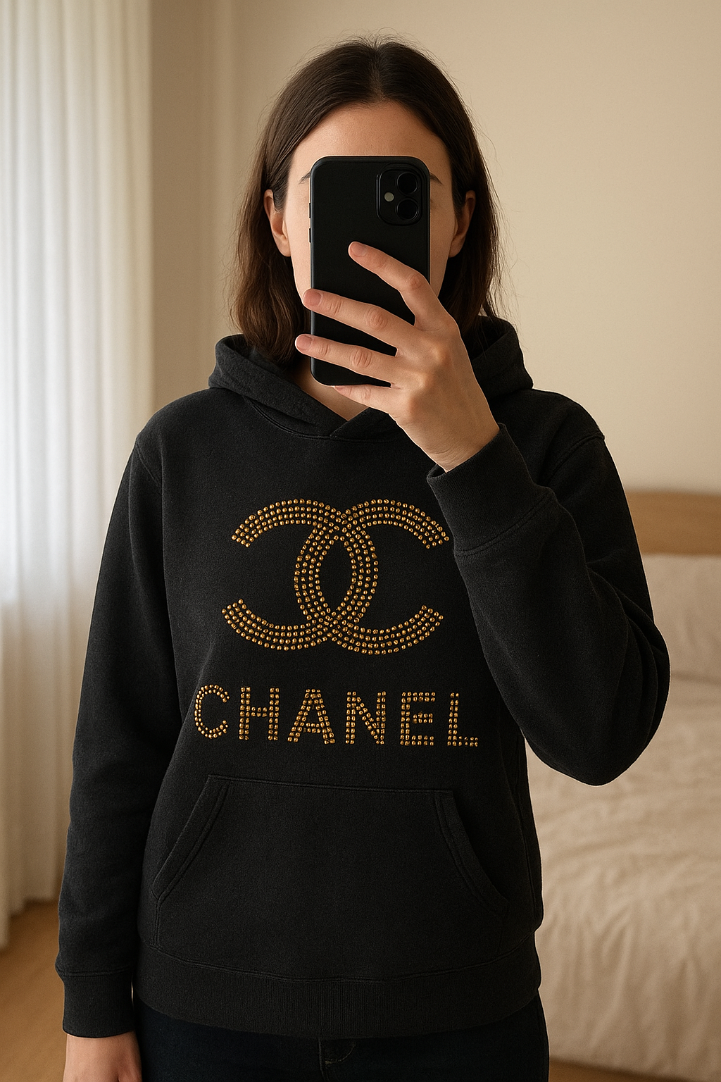 Sweat Chanel debout, face à la caméra, dans une chambre à la lumière douce, avec une lumière naturelle filtrant par la fenêtre.