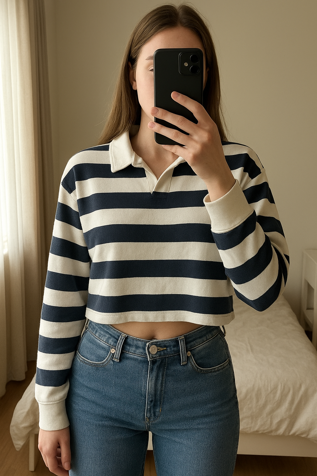 Sweat crop à rayures Bershka – Style marin chic debout, face à la caméra, dans une chambre à la lumière douce, avec une lumière naturelle filtrant par la fenêtre.