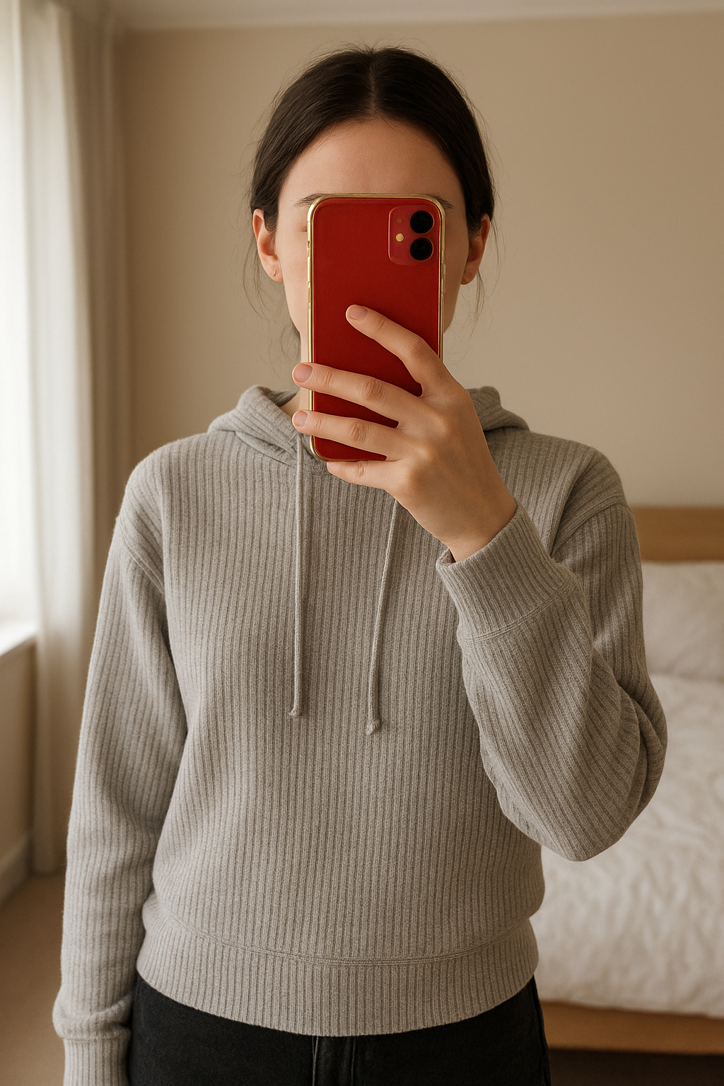 Sweat gris debout, face à la caméra, dans une chambre à la lumière douce, avec une lumière naturelle filtrant par la fenêtre.