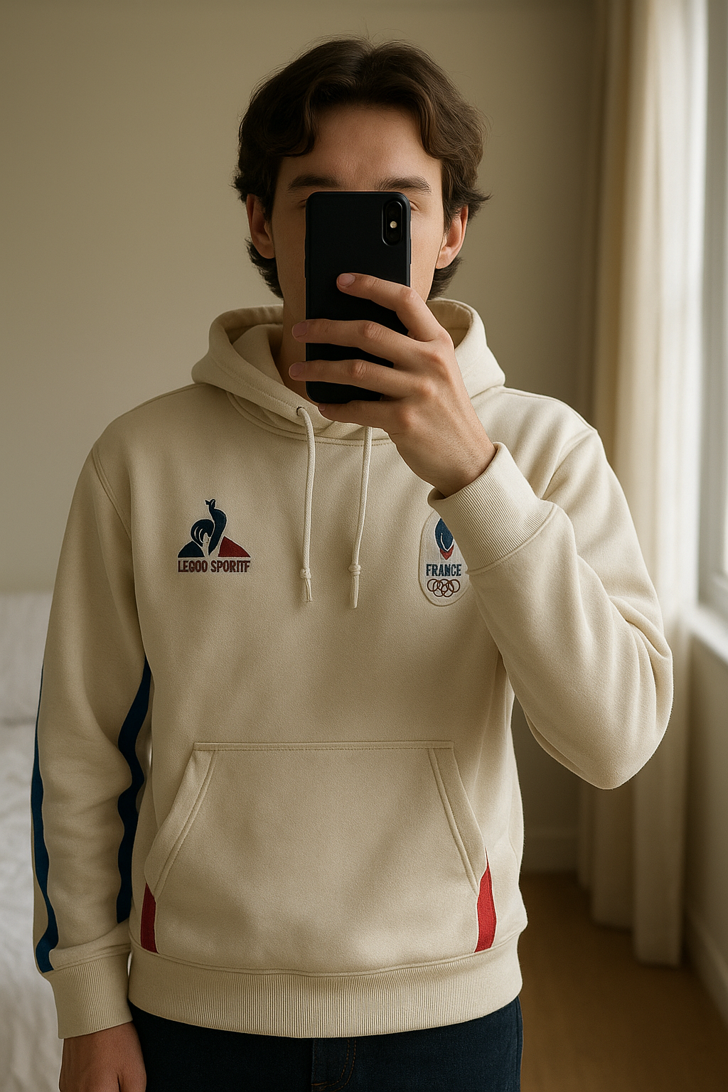 🧥 Sweat Le Coq Sportif France Paris J.O. 2024 – Taille S – Écru debout, face à la caméra, dans une chambre à la lumière douce, avec une lumière naturelle filtrant par la fenêtre.