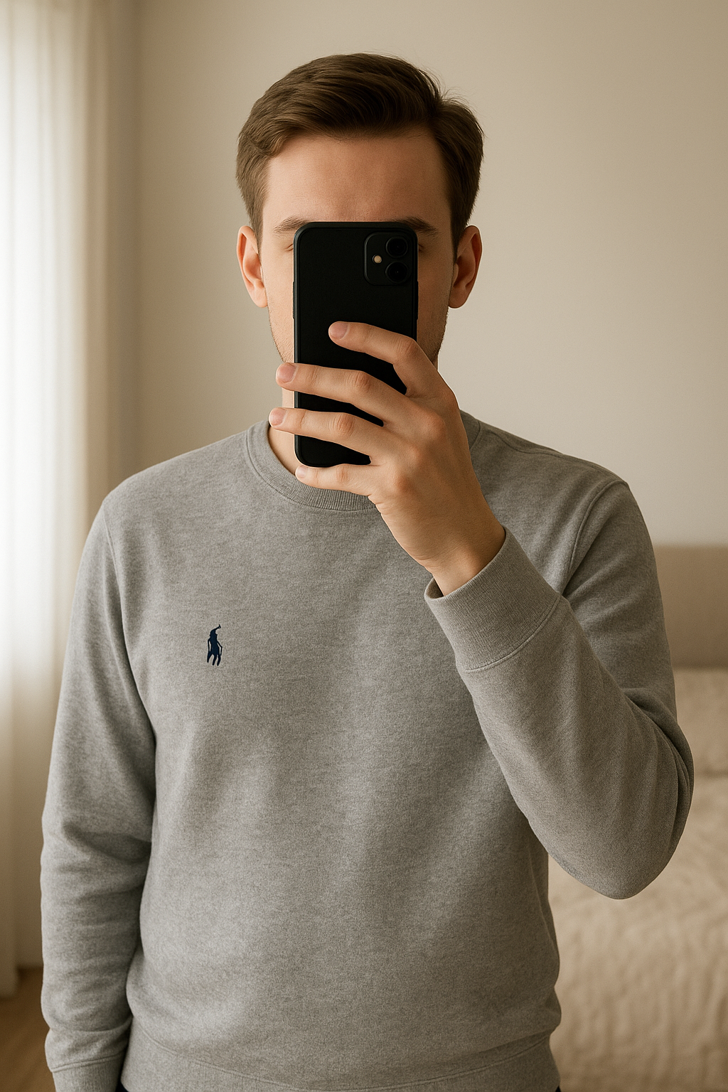 Sweat Polo Ralph Lauren gris chiné – Manches longues – Logo pony bleu – Taille XL debout, face à la caméra, dans une chambre à la lumière douce, avec une lumière naturelle filtrant par la fenêtre.