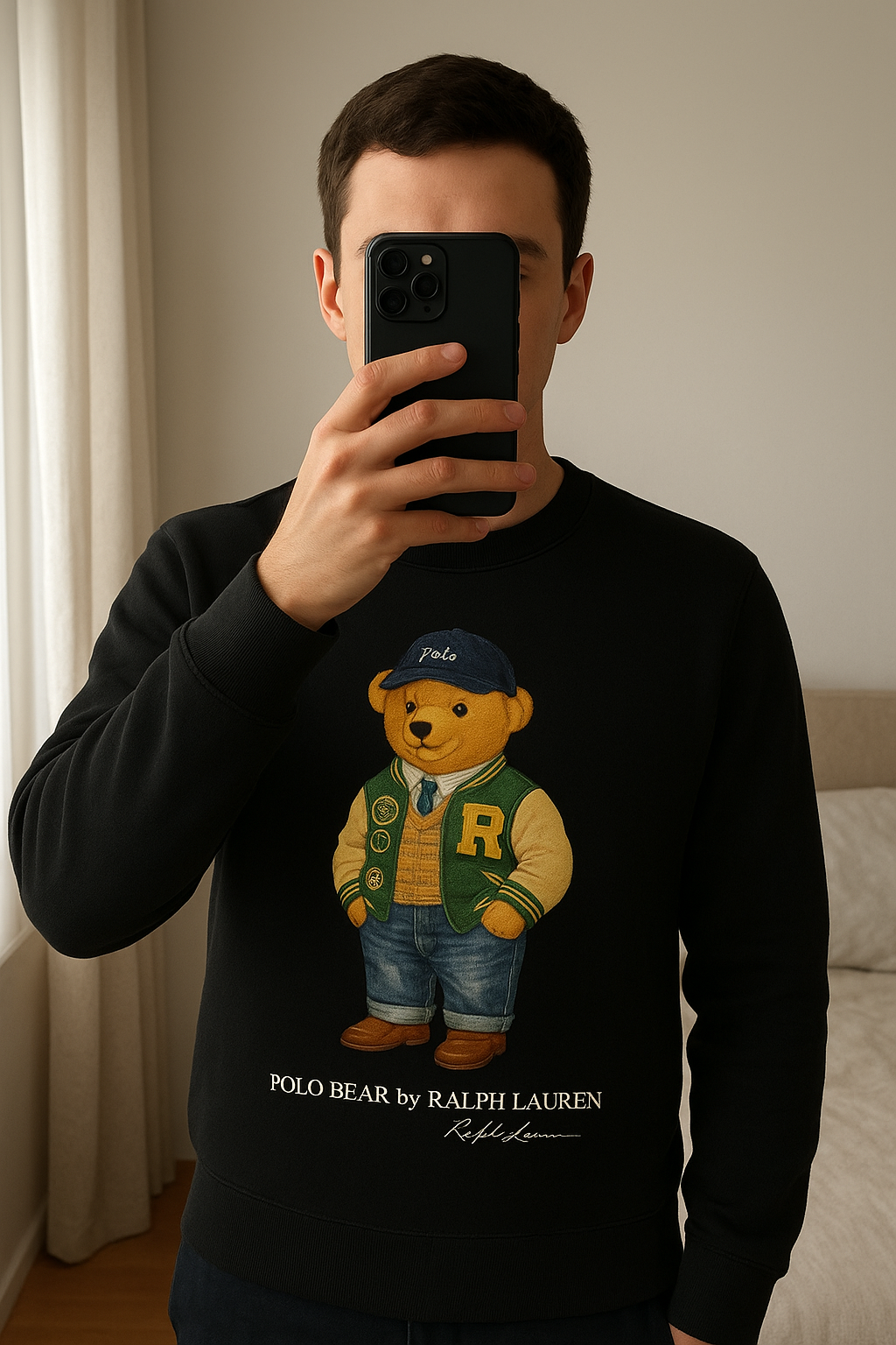 Sweat Ralph Lauren Xl debout, face à la caméra, dans une chambre à la lumière douce, avec une lumière naturelle filtrant par la fenêtre.