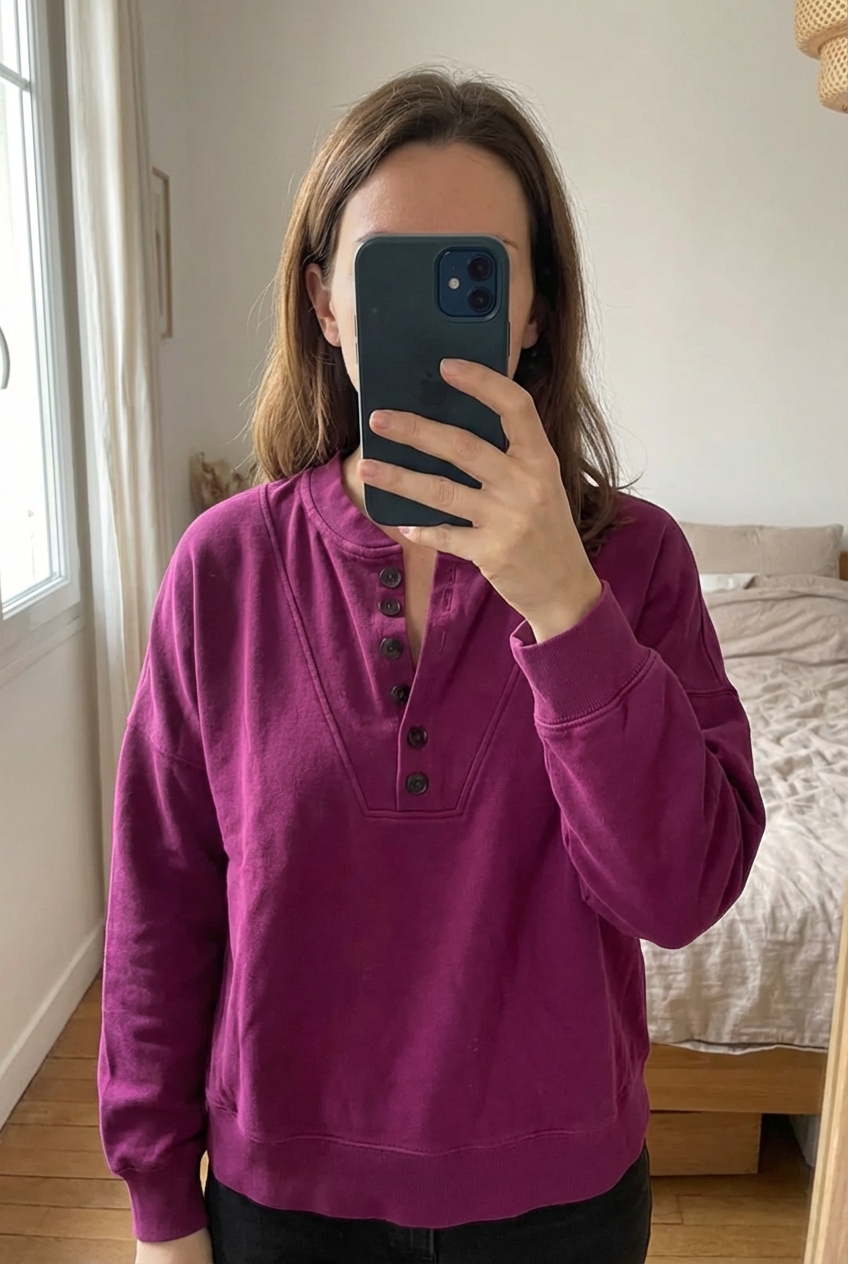 Sweat Sézane violet – T S debout, face à la caméra, dans une chambre à la lumière douce, avec une lumière naturelle filtrant par la fenêtre.