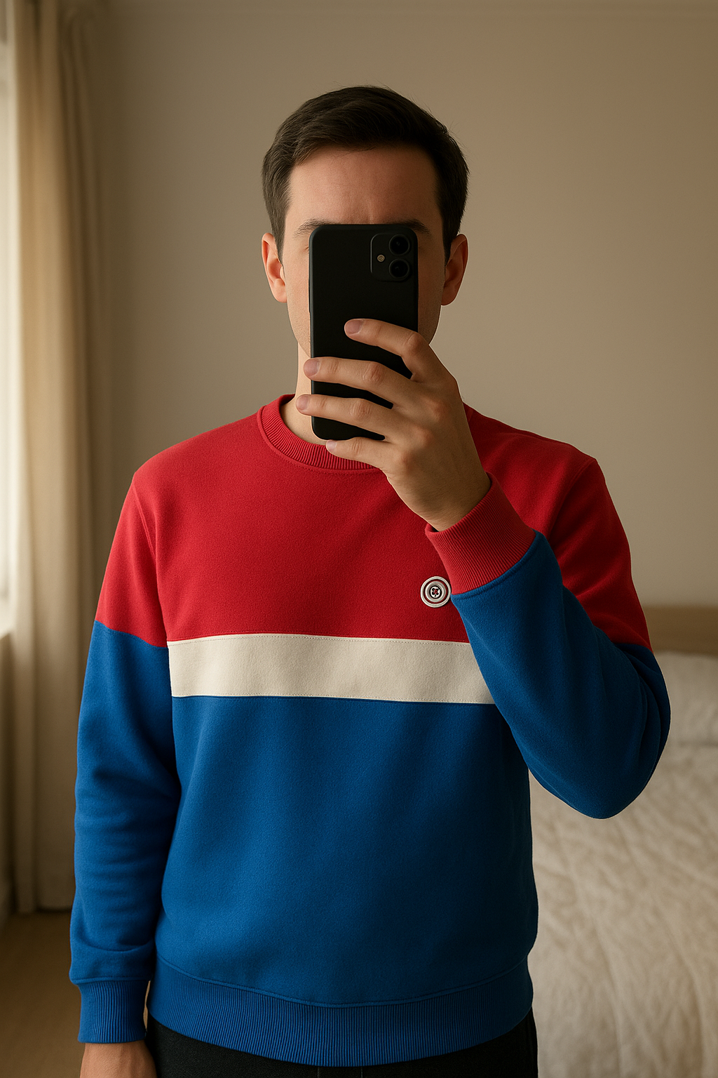 Sweat Serge Blanco debout, face à la caméra, dans une chambre à la lumière douce, avec une lumière naturelle filtrant par la fenêtre.