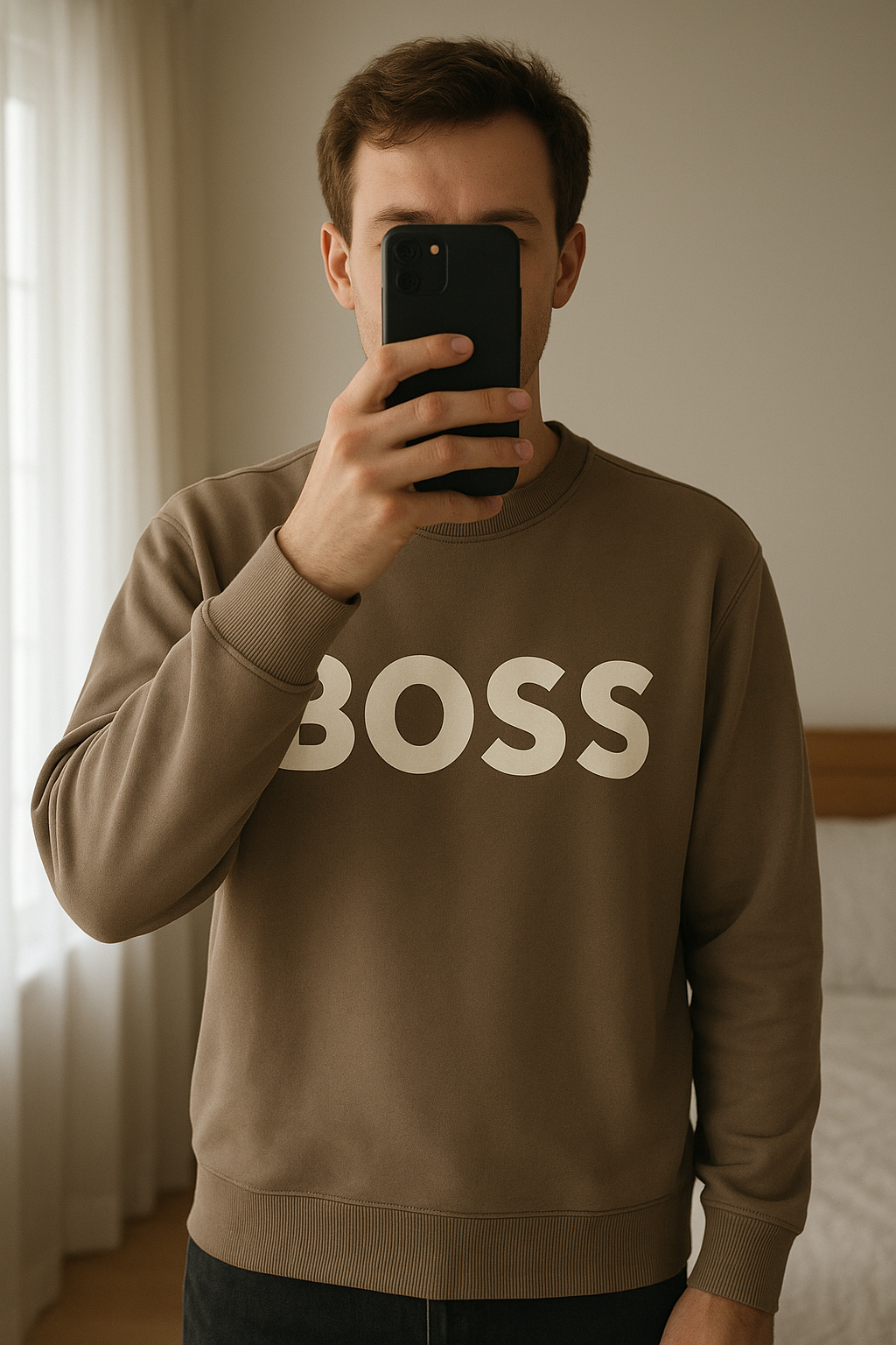 Sweat shirt BOSS col rond crewneck beige taille XL debout, face à la caméra, dans une chambre à la lumière douce, avec une lumière naturelle filtrant par la fenêtre.