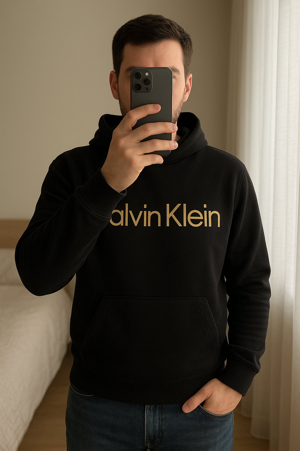 Sweat-shirt à capuche Calvin Klein debout, face à la caméra, dans une chambre à la lumière douce, avec une lumière naturelle filtrant par la fenêtre.