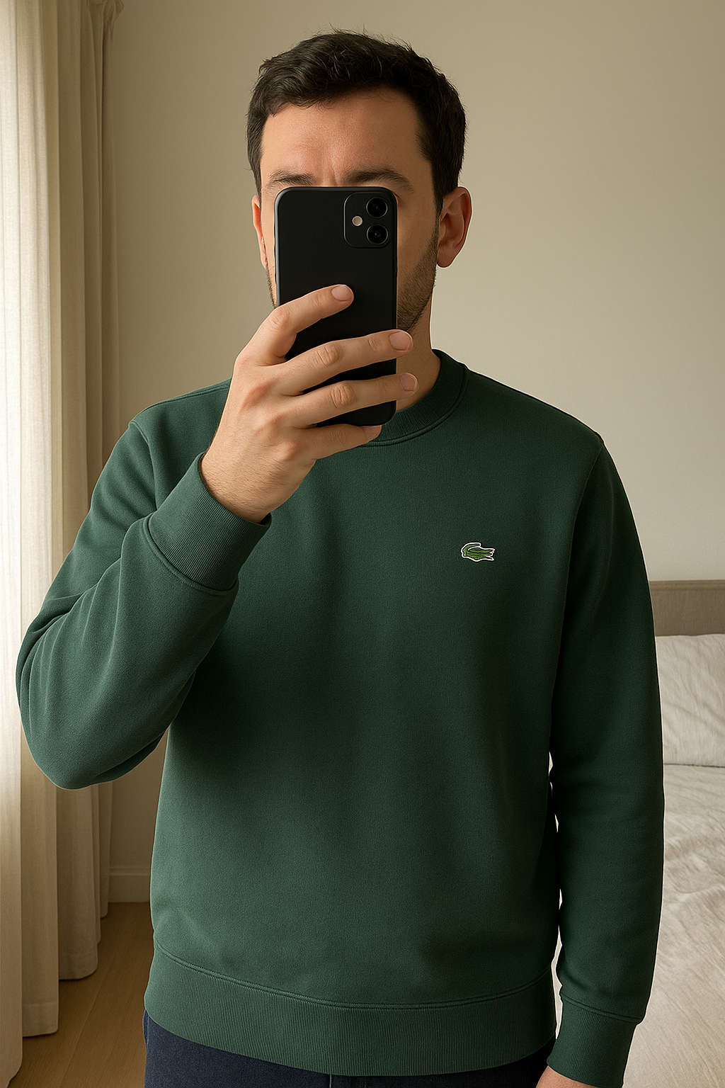 Sweat-shirt Lacoste debout, face à la caméra, dans une chambre à la lumière douce, avec une lumière naturelle filtrant par la fenêtre.