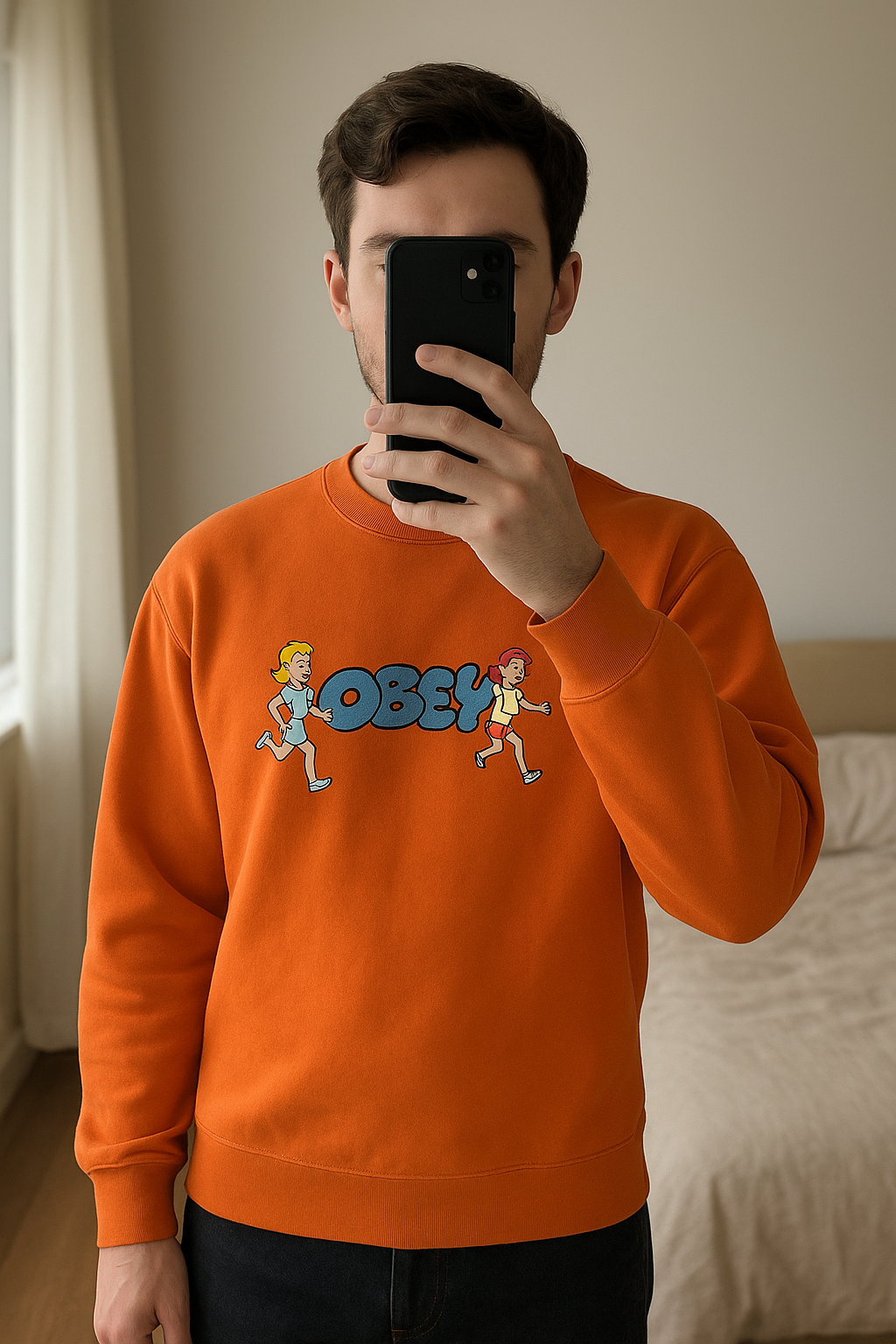 Sweat-shirt obey debout, face à la caméra, dans une chambre à la lumière douce, avec une lumière naturelle filtrant par la fenêtre.