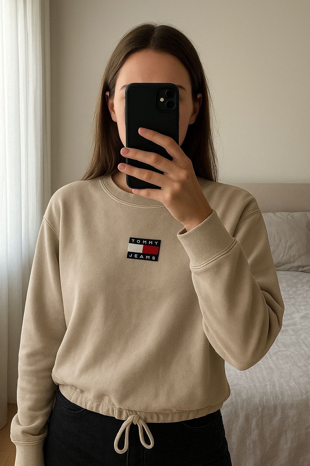 Sweat Tommy Hilfiger debout, face à la caméra, dans une chambre à la lumière douce, avec une lumière naturelle filtrant par la fenêtre.