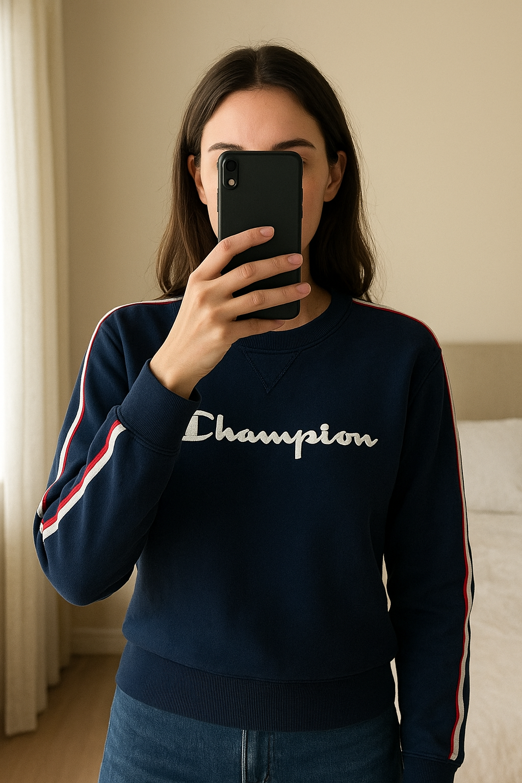 Sweat Vintage Champion debout, face à la caméra, dans une chambre à la lumière douce, avec une lumière naturelle filtrant par la fenêtre.